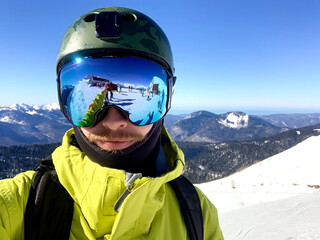 Portrait of young woman at the ski resort on the background of mountains and blue sky.A mountain range reflected in the ski mask