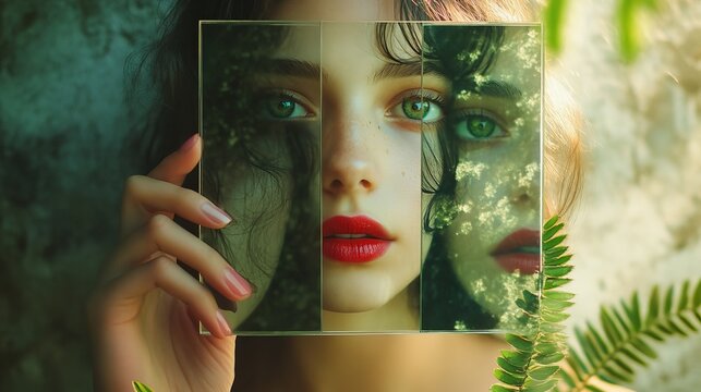A woman holds a dual-panel mirror reflecting her face with nature, merging natural beauty and introspection, against a green background.