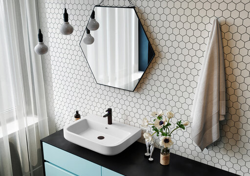 Interior of a modern bathroom with a hexagonal mirror and mosaic walls. 3d rendering