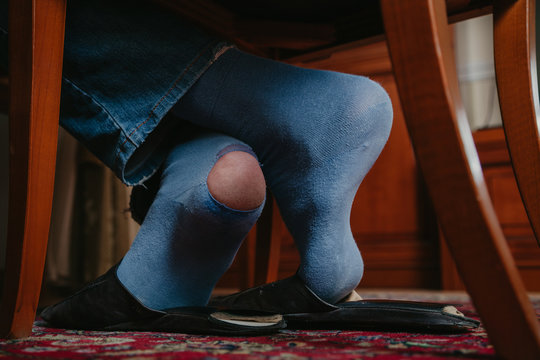 Man sits on chair on his socks can see holes