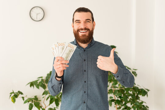 Happy office worker man holding money in hand and showing thumb up.