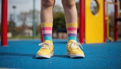 Child feet in colorful mismatched socks and yellow sneakers stand on blue playground surface. Celebrating Odd Socks Day and Down syndrome awareness, promoting solidarity and acceptance of differences.