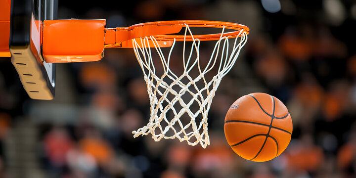 A basketball bouncing off the hoop after a missed shot, captured mid-air with dynamic movement, showcasing energy and action in the game