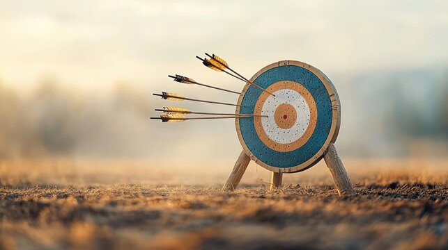 A circular archery target with concentric color rings is pierced by several arrows, highlighting both precision and missed shots, set against a green backdrop.