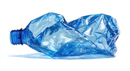 A discarded, crumpled blue plastic water bottle on a white background.  The bottle is misshapen and distorted, highlighting the effects of use and disposal