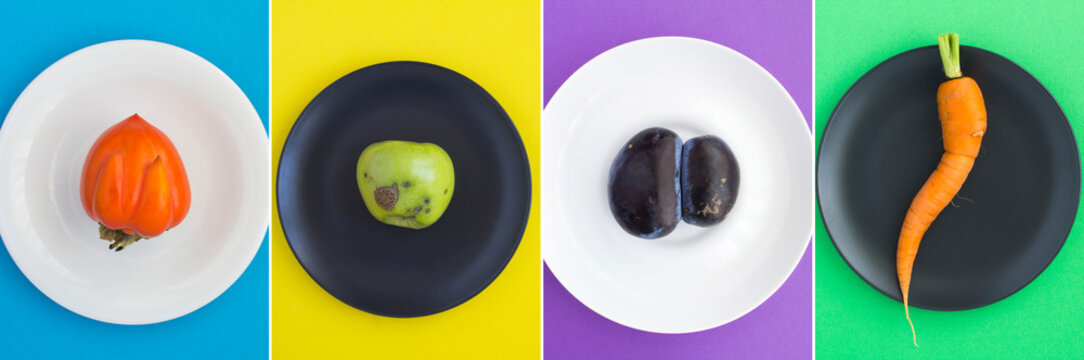 Collage of ugly fruit and vegetable on the black and white plate. Top view. Close-up.