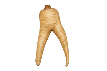 Ugly misshapen parsnip with two roots forming legs, organic root vegetable walking on transparent background