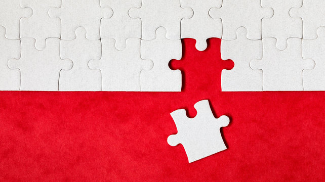 White jigsaw puzzle pieces. Fill in pieces of the jigsaw puzzle. Complete the jigsaw puzzle with the missing pieces. Fragment of a folded white jigsaw puzzle.