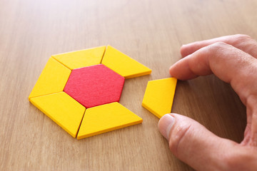man's hand holding a missing piece in a square tangram puzzle, over wooden table