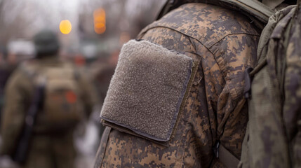 A soldier clad in a camouflage uniform stands among others, showcasing a military patch while enduring the chill of a winter day in an urban environment