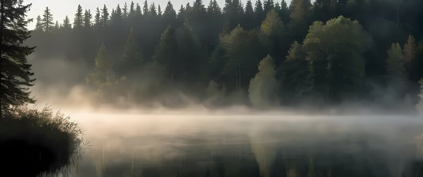 A serene depiction of mist rising from a tranquil lake at dawn the soft light filtering through trees creating an ethereal awakening