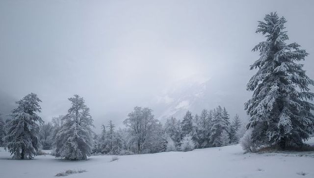 Misty alpine winter landscape with towering snow-covered spruce and open snowy meadow