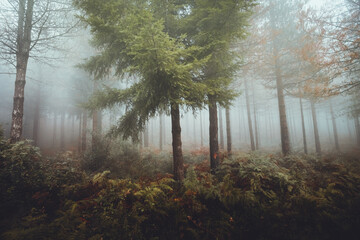 Misty forest with evergreen trees on foggy day