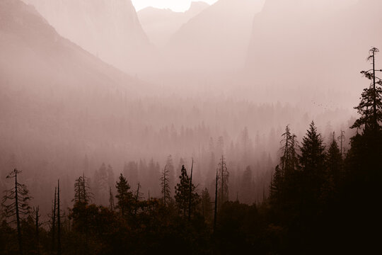 Dramatic mountain landscape with dense pine forest and misty cloud cover
