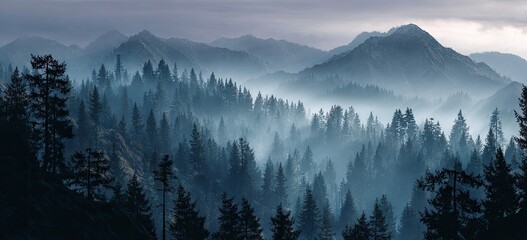 Misty mountain range with dense forests and low clouds