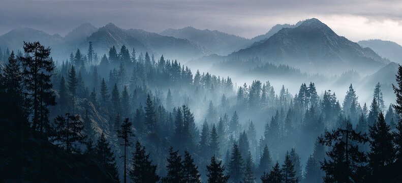 Misty mountain landscape at dawn with serene pine forest