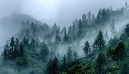 Misty pine forest with dense fog creating eerie atmosphere