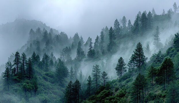Misty Mountain Range With Dense Pine Forest Images