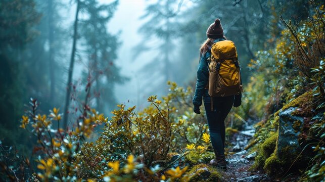 Misty morning trail curving through temperate forest with sunbeams filtering canopy