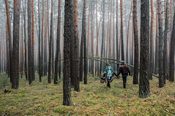 Friends setting up tent during pine forest camping adventure