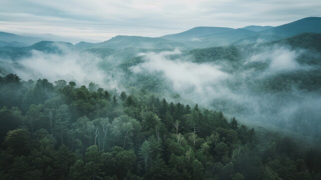 Misty mountain range with dense pine forest