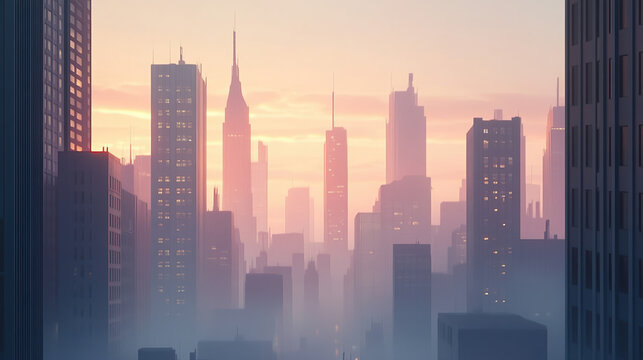 A misty city skyline at dawn, featuring towering skyscrapers and a soft pastel sky, creating a serene urban atmosphere.