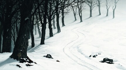 Winding snow-covered path curving through misty conifer forest with fog-dusted branches