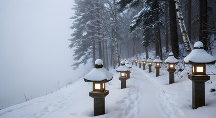 Glowing vintage lanterns leading snow-covered pathway through misty twilight winter forest