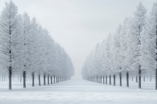 A serene winter landscape featuring snow-covered trees lining a winding road through misty mountains.