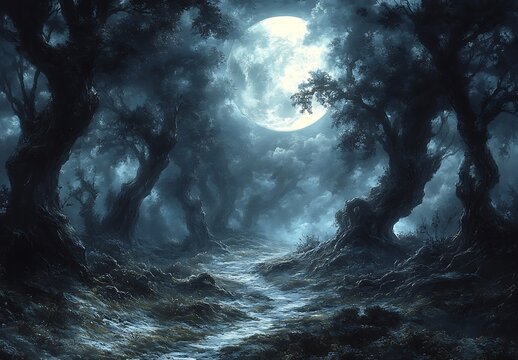 Moonlit snow-covered forest trail with trees bending under heavy snow, tracks on frozen path