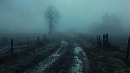 A road leading through thick fog turns into a blurred line against the background of a rural landscape. The clouds blend into the fog, giving the whole scene an uncertain, unsettling feel