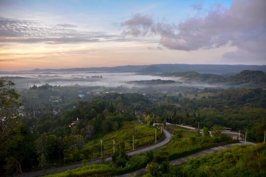 Early morning landscape. Foggy forest. Footpath through the forest in a fog at sunrise