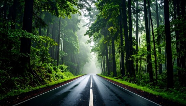 Misty forest road. Lush green trees line a wet asphalt road, leading into a hazy distance