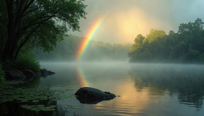 Beautiful rainbow arcs over misty lake during light rain shower. Green trees line distant shore. Calm water reflects colorful sky and forest.