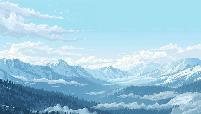 Misty pixel-art forest canopy spilling into layered valley with distant ridge horizon