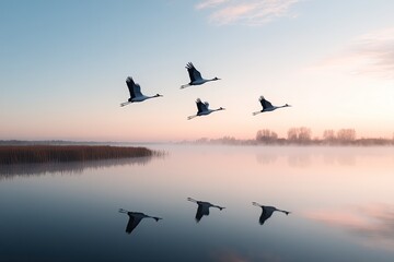 group of cranes flying over misty wetland at dawn their silhouettes reflecting in still water below