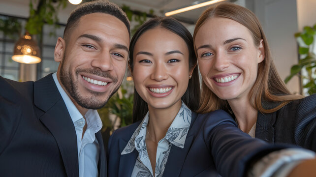 A group of people are smiling for the camera. The group is diverse, with people of different ages and races. Scene is happy and friendly, as everyone is posing together and enjoying the moment