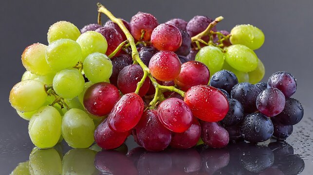 fresh mixed grapes with water droplets, green, red, and black varieties on dark background, healthy fruit concept for nutrition and freshness
