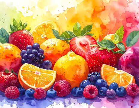 Vibrant watercolor image featuring mixed berries, citrus fruits, and grapes against a colorful, expressive painted background
