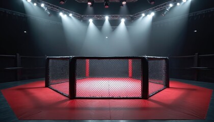Empty MMA octagon ring with red mat cage fence and bright spotlights. Dark arena interior for mixed martial arts fighting competition training.