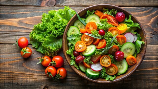Fresh garden salad with cherry tomatoes and mixed greens overhead view