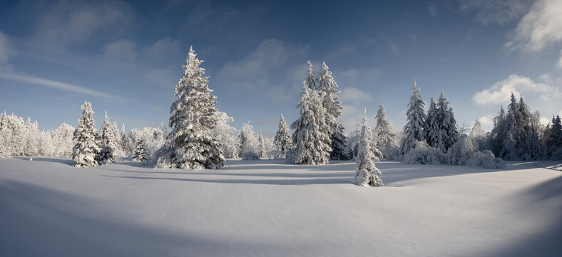 Winter panorama of an idyllic snow covered forest under a blue sky with white clouds. The foreground is a snowy clearing, midground with spruce trees and a background of mixed trees.