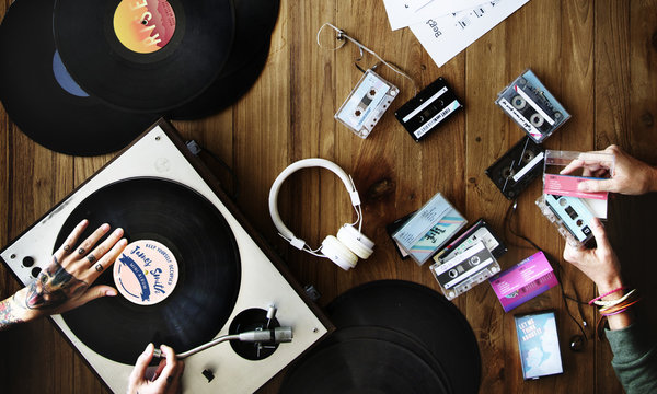 Hifi retro vinyl player is turntable with an analog audio CD.