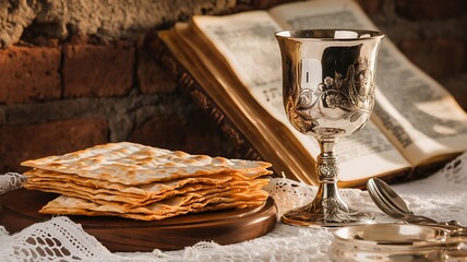 Passover Seder Celebration with Silver Kiddush Cup and Matzah Bread on Wooden Board - Traditional Jewish Pesach Ritual with Sacred Wine Goblet and Unleavened Bread against Rustic Brick Wall photo