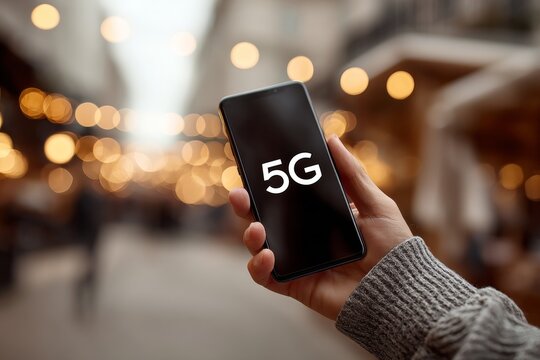 Close-up of a hand holding a modern smartphone with 5g symbol