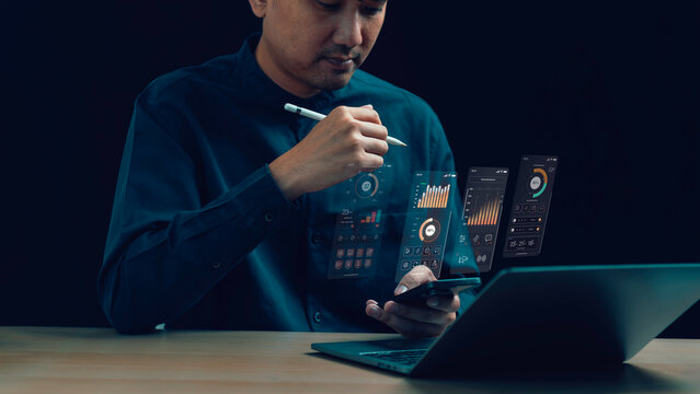 Dashboard With Financial Analytics Graphs, Businessman Data Analytics Dashboard And KPI Performance management innovative software in smartphone for real time monitoring.