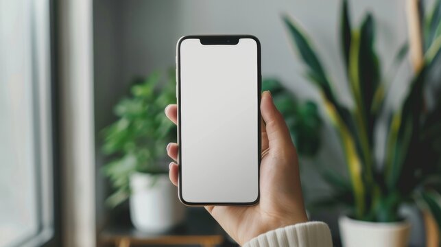 Hand Holding Smartphone With Blank Screen in Front of Window. Generative AI