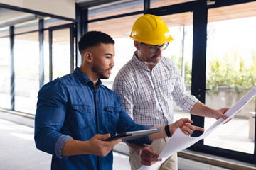 Diverse business people holding architectural plans, using tablet, talking work at office, unaltered