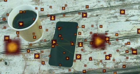 Smartphone with floating social media icons and connecting network heatmap on rustic wooden table