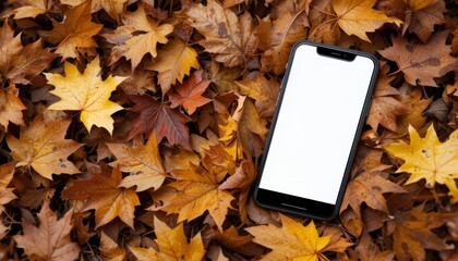 Black phone lying on pile of brown and yellow leaves, scattered tips, autumn scene.